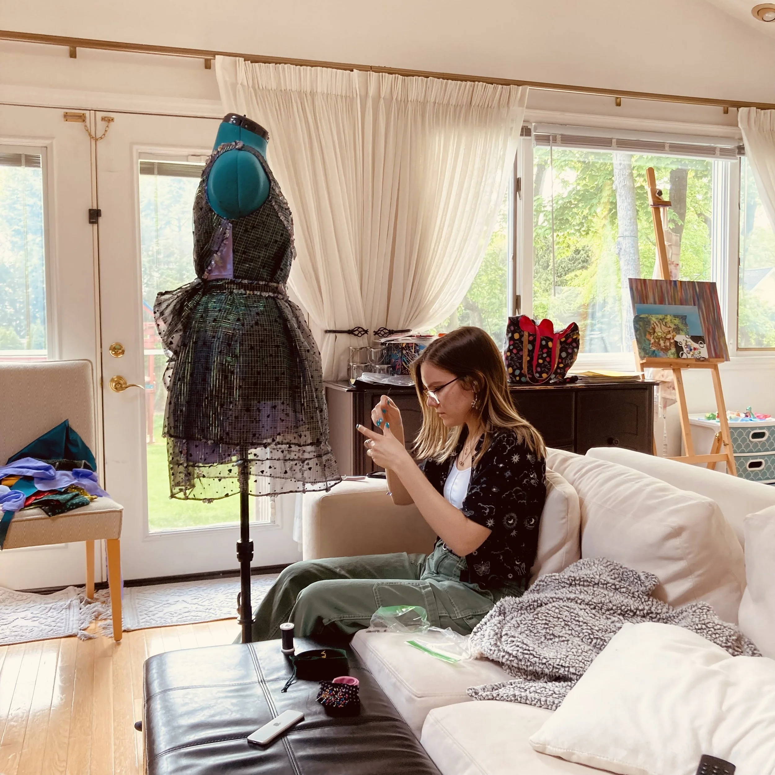 Fabric Beading: Green and purple (gradient) mix of stone beads and grey foggy accent crystals, white thread